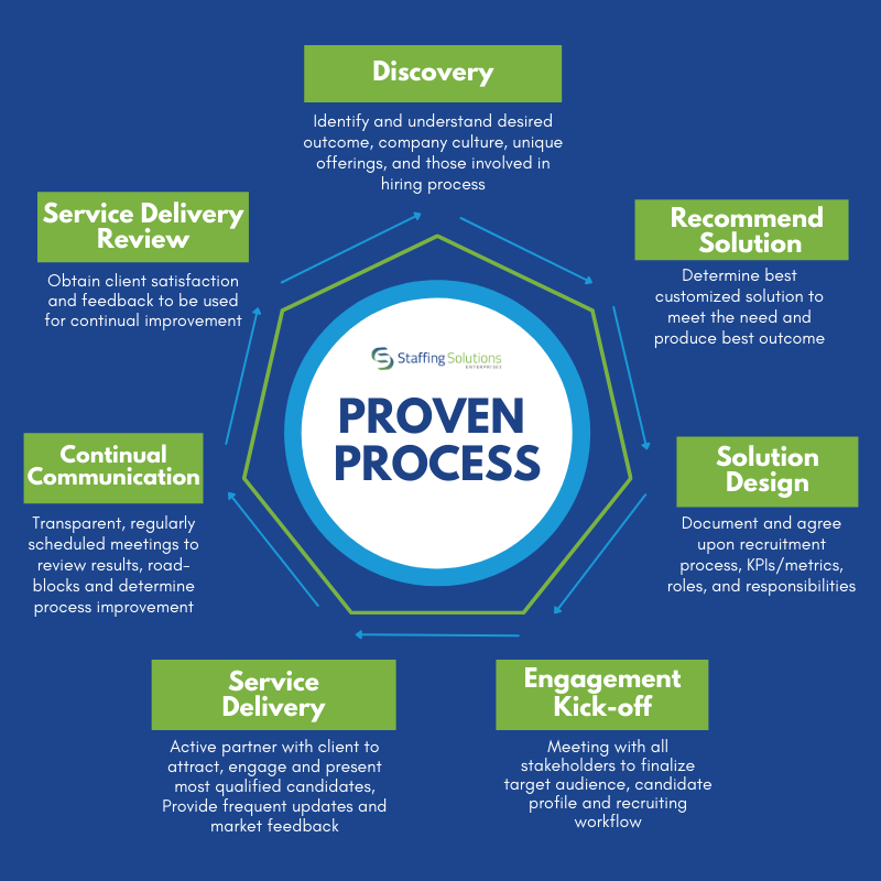 Our Proven Process is a continuous cycle of our operations at SSE. This process demonstrates how we work with clients to provide exceptional service from first touch to final steps. We begin with the Discovery phase of client needs, and move through Design, Solutions, Service Delivery, Continual Communication, and Service Delivery Review.